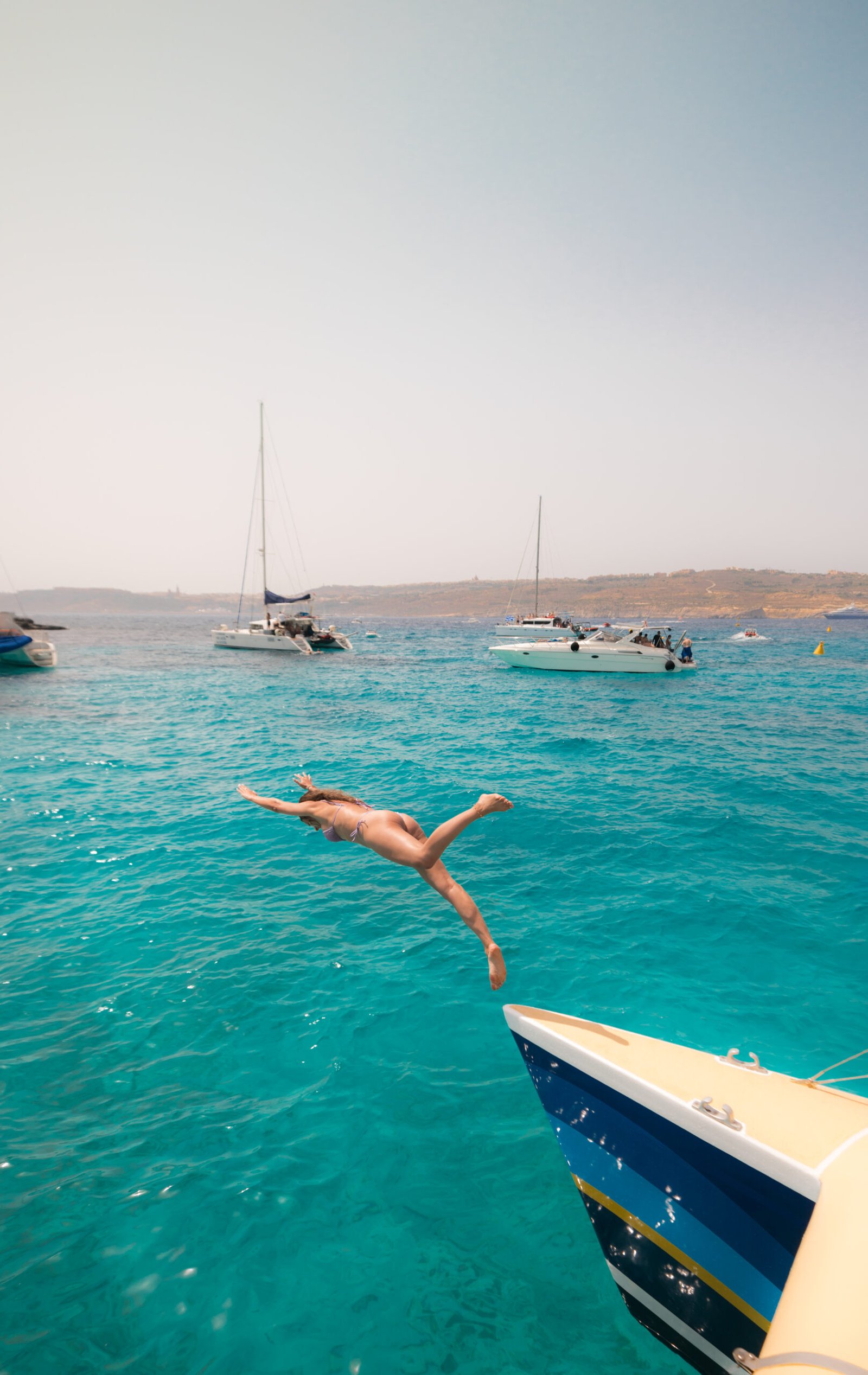 The first destination is the famous Blue Lagoon in Comino. Known for its incredibly clear turquoise water and white sandy seabed, it is considered one of the most beautiful swimming spots in Malta.